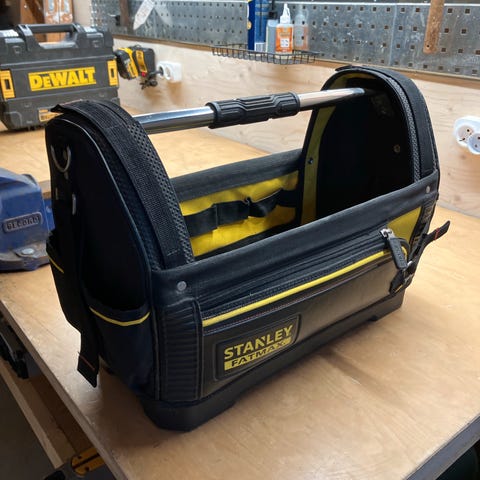 Tasken har flere lommer og rum til opbevaring af værktøj, med robust lynlås og håndtag.