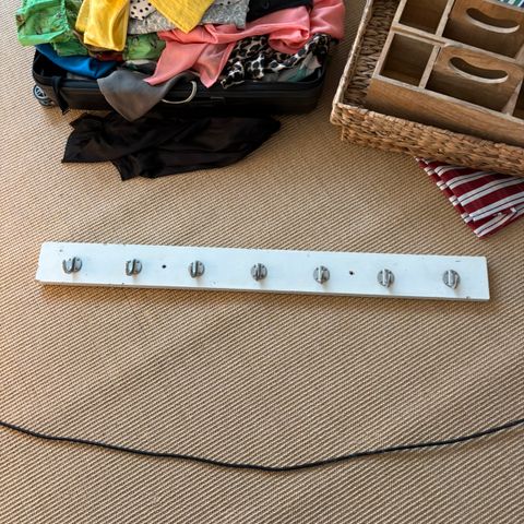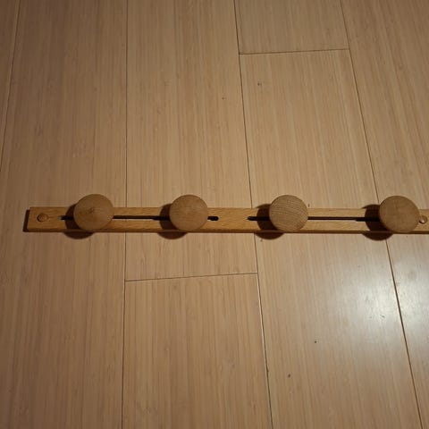 Fin gammel knagerække i eg. Det er gammelt håndværk, hvor “brættet” er drejet, inden krogene er sat på. Den er ca. 70 cm lang og er udstyret med 6 kroge, som heldigvis alle er originale. Naturligvis er den brugt, hvilket ses, men den er i en mega fin stand - med alderen i mente - bl.a. uden ormehuller.