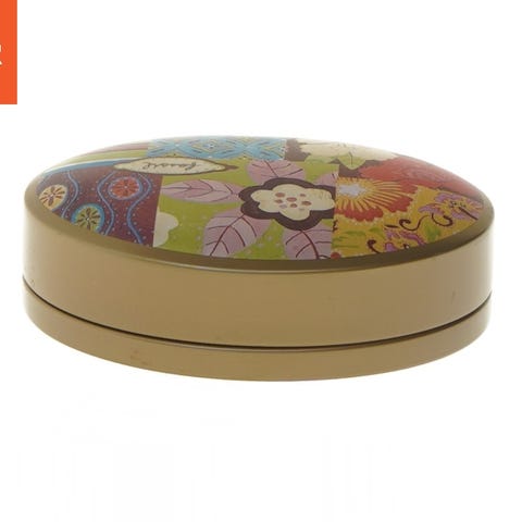 Denne lille smykkeæske er dekoreret med en figur af en havfrue, der er udført i guldfarvet materiale og prydet med røde og grønne accenter. Æsken har en oval base med en lilla finish, der minder om marmoreret tekstur, og ordet 'DENMARK' skrevet foran på æsken. Øverst er der en detaljeret kant og æsken kan åbnes for opbevaring af små genstande. Der er magnet lukning og den er lavet i et metal marriale.