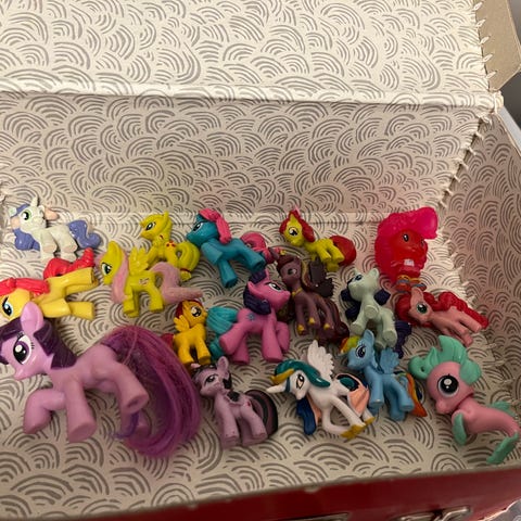 23 stks My Little Pony legetøjssæt bestående af flere forskellige ponyfigurer i forskellige farver og størrelser. Sættet inkluderer også tilbehør som kamme og små dele til styling af ponyernes manker og haler. Egnet til børn og samlere, fremstillet af plastikmateriale.