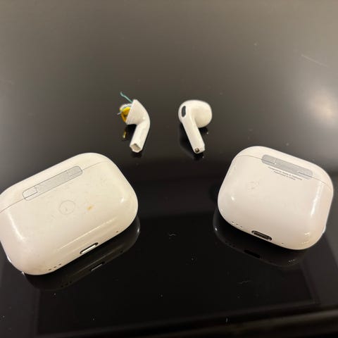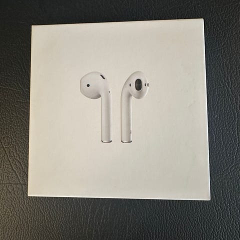 Trådløse airpods med et hvidt opladeretui. Designet til at være kompakt og bærbar, og æsken har en størrelse på 6x4 cm. Ideelle til musik elskere på farten, og tilbyder god lydkvalitet og komfort. Tags: høretelefoner, trådløs, in-ear, lyd.