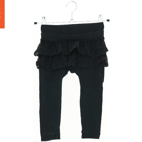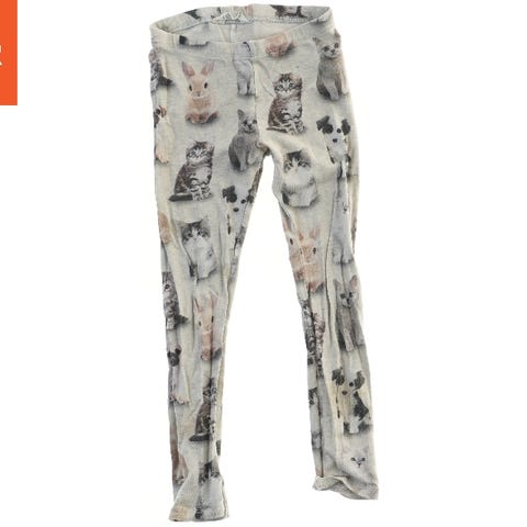 Grå børneleggings med elastisk taljebånd og tryk af to katteansigter nederst på benene.