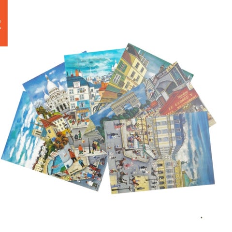 En samling af postkort med forskellige motiver fra Paris, herunder billeder af Eiffeltårnet og andre ikoniske steder. Størrelsen af postkortene er 17 cm x 11,5 cm og 15 cm x 10 cm. Velegnede til at sende til venner og familie som en kunstnerisk hilsen eller til kreativ hobbies som scrapbooking.
