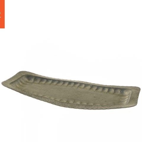 En oval metalfad med en diameter på 23 cm. Fadet har et rustikt udseende med en ujævn overflade og en let bølget kant. Det er primært gråt i farven og kan bruges til servering eller som dekoration.