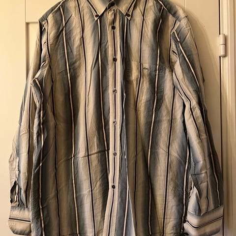 Klassisk vintage sort Lacoste skjorte med lange ærmer og et stribet mønster i grå og hvide farver. Skjorten har en brystlomme med det ikoniske Lacoste logo. Knapperne er graveret med 'Lacoste'.