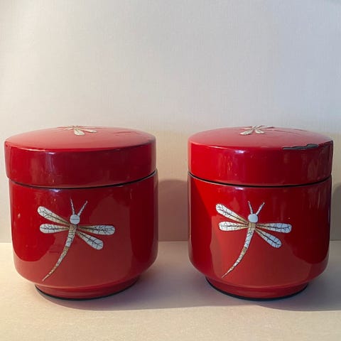 Kinesiske ingefærkrukker og tallerken - alt af metal