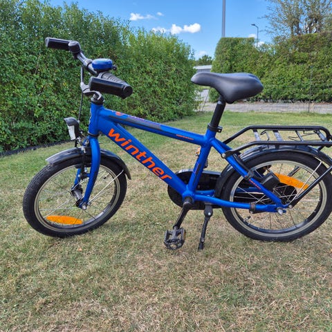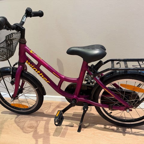 Winther W150 børnecykel med 16 tommer hjul, lyserød ramme, udstyret med kurv foran, bagagebærer og støtteben. Cyklen er køreklar med forsikringsgodkent lås samt for- og baglys.