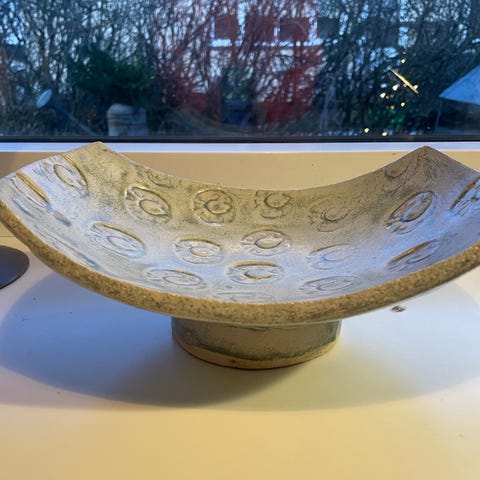 Større, blå skål, højde 16 cm og ca. 21 cm bred. God stand og kan sendes sikkert eller evt. medbringes Jylland / Sjælland.