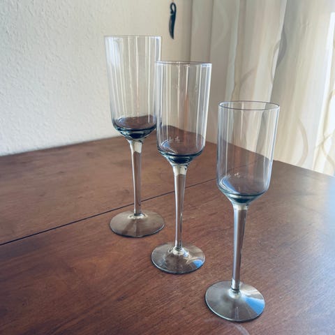 Røgfarvede Stub glas designet af Grethe Meyer og Ibis Trier Mørch for Holmegård i 1958. De er mundblæste med signatur under foden og stabelbare. Alle uden synlige spor og vasket i hånden