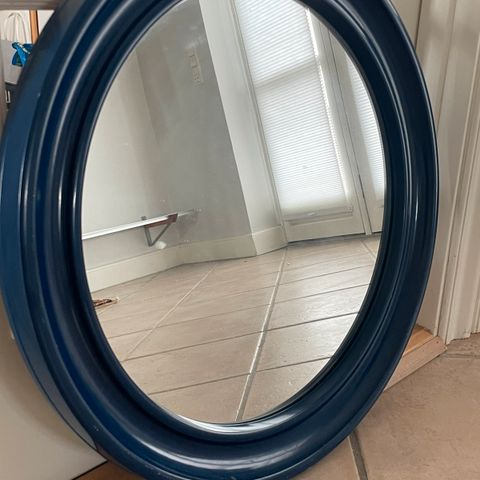 Der er to minimale ridser i glasset. De er så små, ar de ikke ses umiddelbart. Ellers er spejlet fint og intakt. Det har en diameter på 30,7 cm, og rammen er 3 cm dyb.