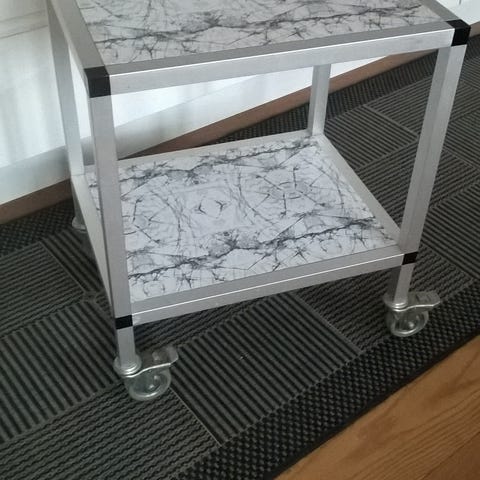 Klassisk dansk design med rund bordplade og hylde, monteret på hjul så det nemt kan flyttes rundt. Perfekt som serveringsbord, barbord eller lille sofabord. Bordet har brugsspor i form af små ridser og mærker, men står stadig solidt og funktionelt. Flot retrolook, der passer ind i både moderne og klassiske hjem.