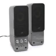 Creative Gigaworks T20 computerhøjttalere med 2.0 stereo lydsystem. Højttalerne er sorte med en kombination af plast og stofmaterialer. De har indbyggede kontrolknapper til lydstyrke, diskant og basjustering, samt en LED-indikator. Højttalerne er designet til brug med computere og andre lydkilder via kablet tilslutning.
