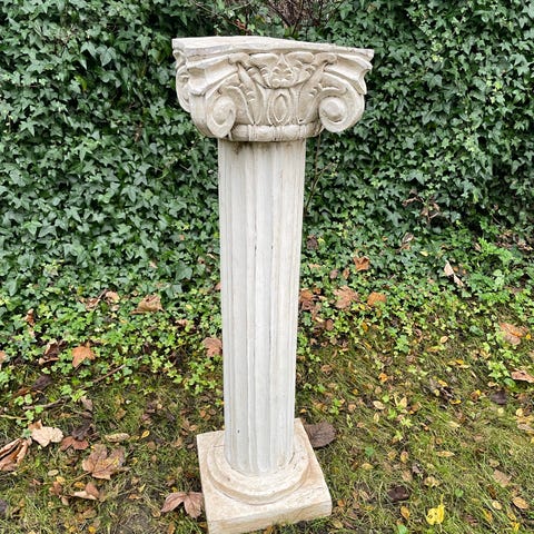 Dekorativ søjle fremstillet i stenmateriale med klassisk søjledesign. Søjlen har en flad top og en kvadratisk base, velegnet til brug som havepynt eller indendørs dekoration.