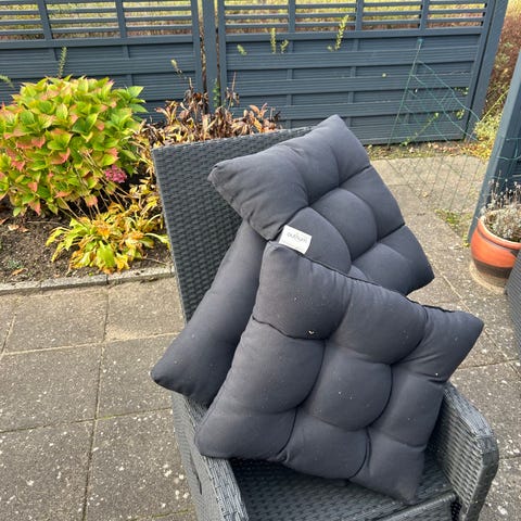 Flettet på den ene sofa og de to stole er malet sorte og trænger til et ekstra lag