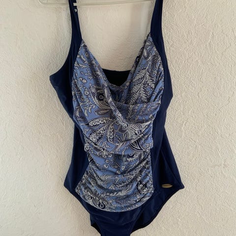 Style Pamela str medium, marineblå med hvide prikker og rød tittekant.