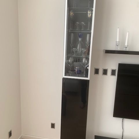 Målene er 50x50x180 og der er to ruder på skufferne der er knækket eller mangler. Der følger 4 akeylhylder og 3 skuffer med.