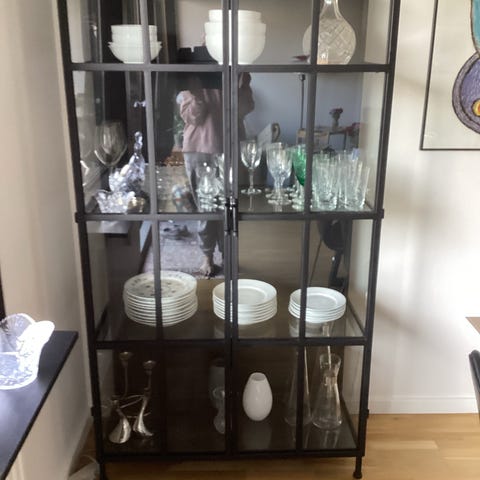Sælger dette hjemmebyggede vitrineskab af mdf, akrylglas og metalbeslag.