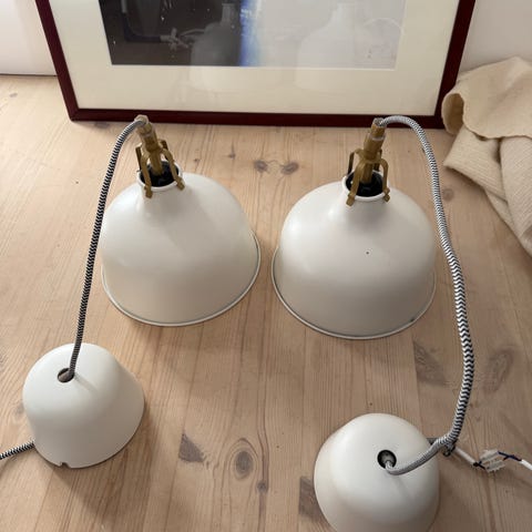 To pæne hvide mindre lamper, velegnet til over køkkenbord, sælges for kr. 300,-