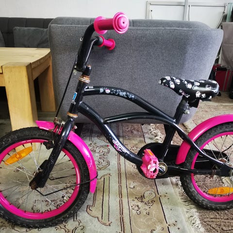 16" Mustang pigecykel i pæn og velkørende stand med forbremse, bagagebære og ringklokke.