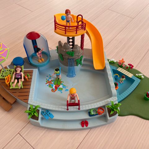 Playmobil Summer Fun Børnelegetøj Svømmebassin med Rutsjebane. Inkluderer et svømmebassin med en blå rutsjebane, en delfinfigur og tilbehør som liggestole og parasoller. Legetøjet er designet til børn i alderen 4-10 år og fremmer leg og fantasi omkring vandaktiviteter.