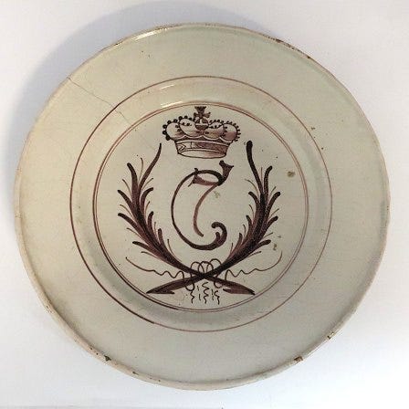 Store Kongensgade fajance. Tallerken dekoreret i blåt med Christian Vll's kronede monogram. Diameter 21,5 cm.