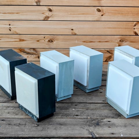 Kasse med 7 brugte udendørslamper, 4 af dem med indstillelig sensor og 3 uden sensor.