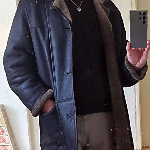 Jakken er i mørkebrun (d.-braun) med varm pelskrave og foret inderside med flere praktiske lommer.