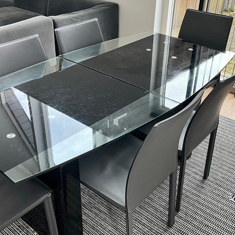 Lækkert designer aluminiumsbord, som også kan bruges udendørs. (har dog altid stået indendørs). Længden er inkl 2 tillægsplader á 40 cm, som kan opbevares i bordet. Det har nogle ridser mm. Se billeder.