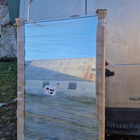 Glasmål er 265 x 84,5 cm. Er med fiberarmeret bagside. Er fra en skydedørsgarderobe der er nedtaget. kan evt limes på væg eller monteres i en anden ramme. Spejlglasset er ikke tonet.