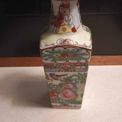 Kinesisk vase med blomstermotiv og guld hak og fødder. I fin stand har et lille sted hvor malinger er skallet af se billede