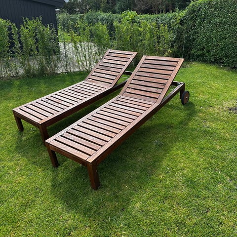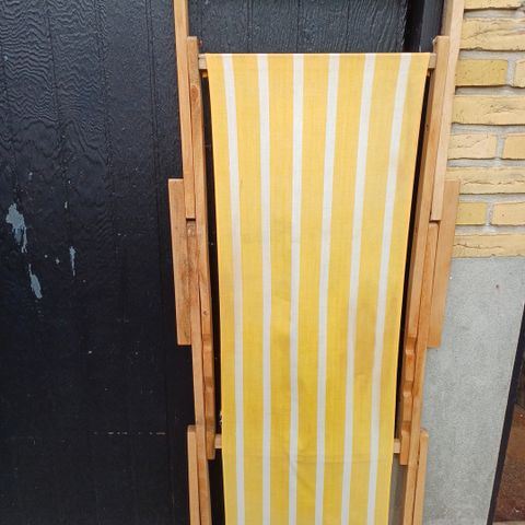 4 stk retro have ligge stole i træ konstruktion og med bommuld kanvas i brune og orange striber. Jeg er usikker på hvor gamle de er, nok fra 70-80 erne. De har altid stået tørt og er i fin stand trods de er gamle. Rust på skruer. Et lille hul i det ene kanvas (1cm) men ellers er kanvas også i fin stand) .