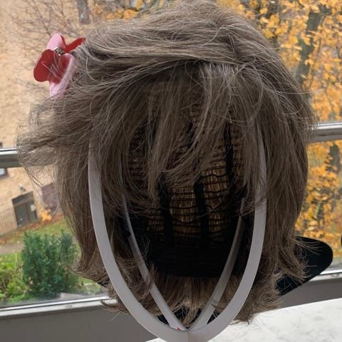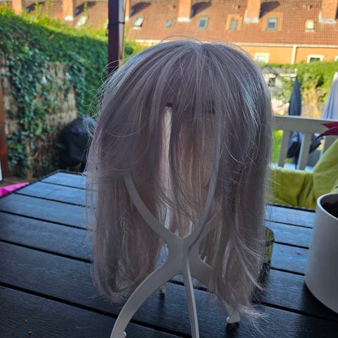 Lys-grå. Lige købt den af anden person, men jeg har aldrig brugt den da håret er for langt ift mit eget. Brugt 2 gange af forrige ejer. Helt nyvasket og plejet. Shampoo, balsam, leave in treatment og børste samt halvt fyldt Milkshake color grey medfølger så man evt kan farve den. Nypris 5.000 kr. Afhentes Stengårdskvarteret, Bagsværd.