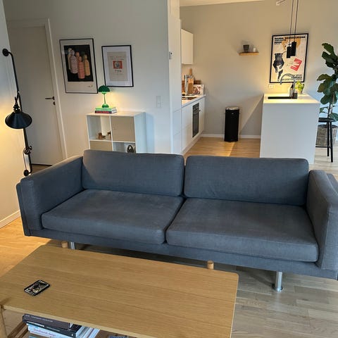 Grøn uld, 3 personers 212 cm , lille flig er fået af stof UNDER sofaen, mod gulv , ingen praktisk betydning og kan ikke ses med mindre du ligger inde under sofaen