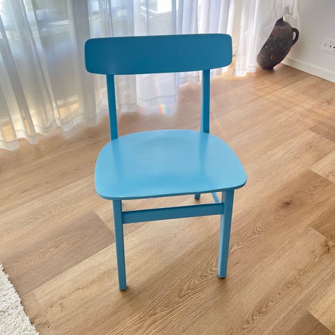 4 blå træstole i fin stand, synlige almindelige brugsspor. Gode som ekstra stole.