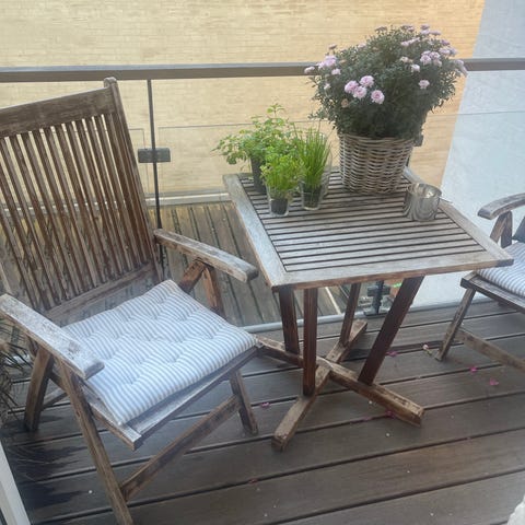 Havemøbelsæt bestående af et ovalt træbord og fire matchende træstole med armlæn. Møblerne er designet til udendørs brug og har en naturlig træfinish. Sættet er velegnet til have eller terrasse og kan rumme flere personer til måltider eller samvær.