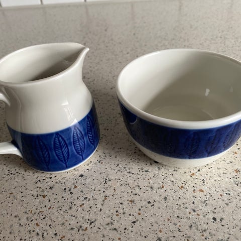 Rörstrand Koka gryde i blå og hvid porcelæn. Gryden har låg med greb og to håndtag, hvilket gør den velegnet til tilberedning og servering af mad. Porcelænet er varmebestandigt og designet til brug i køkkenet. Med låg, ovnfast, er i fin stand uden fejl. Ingen glasurfejl. H: 19,4 cm. H: 11 cm