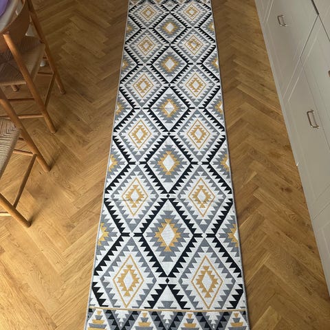 Tæppet er aldrig brugt, og har fortsat påsat prisskilt.