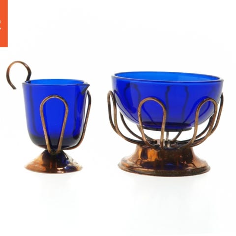 Sukkerskål og flødekande i glat koboltblåt glas.