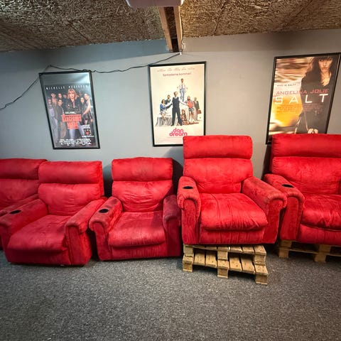 Biografstol i rød plys med armlæn sælges for kr. 750,- Stammer fra Vanløse biograf..