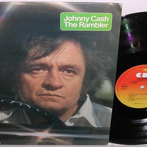 Johnny Cash Rock Island Line vinylplade med sange som Rock Island Line, Get Rhythm, Train of Love, My Porter og Come In Stranger. Pladen indeholder to sider med flere numre, herunder The Wreck of the Old 97 og I Heard That Lonesome Whistle. Coveret viser billeder af Johnny Cash og information om produktionen. Produktet er en fysisk vinylplade med originalt cover.