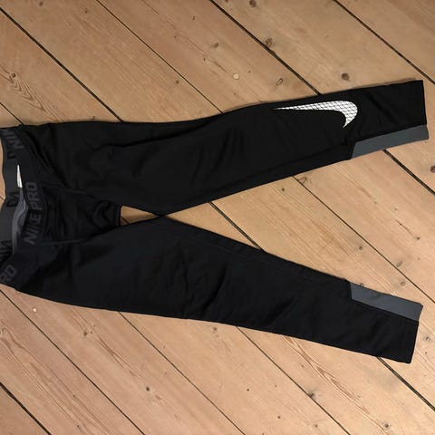 Rigtig fine Nike Pro baselayer varmebukser i dri-fit og kompression i størrelse 13-15 år (XL). Super-gode til udendørs sport om vinteren.