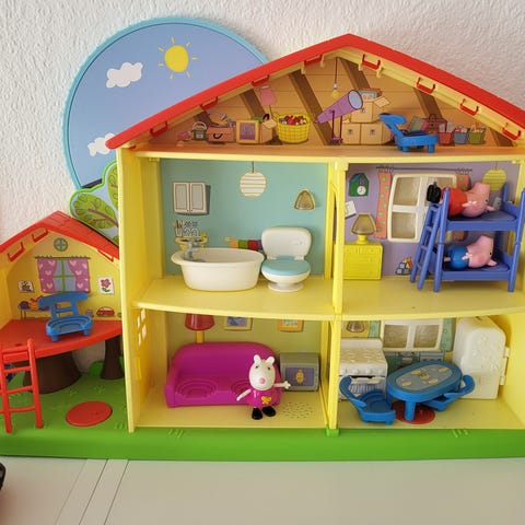 Gurli Gris Peppa Pig legehus med tilhørende figurer og møbler. Legehuset har flere rum og er designet i farverne gul, rød og blå. Indeholder små figurer af Gurli Gris-familien samt diverse møbler som sofa, bord, stole og andre tilbehør. Legetøjet er velegnet til børn og fremmer kreativ leg. Et klistermærke er halvt revet af, og der er lidt pletter på andre klistermærker.