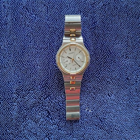 Pulsar herreur med guldfarvet rustfrit stål. Uret har en rund urskive med datovisning og dagindikator. Vandafvisende op til 100 meter. Inkluderer urskive og metalarmbånd med lås.