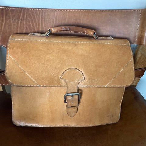 Stor lædertaske med masser af plads og lommer, i en flot cognac læder farve, fra mærker “Baron”. Er brugt og noget er metallet har fået lidt patina, men ellers god.