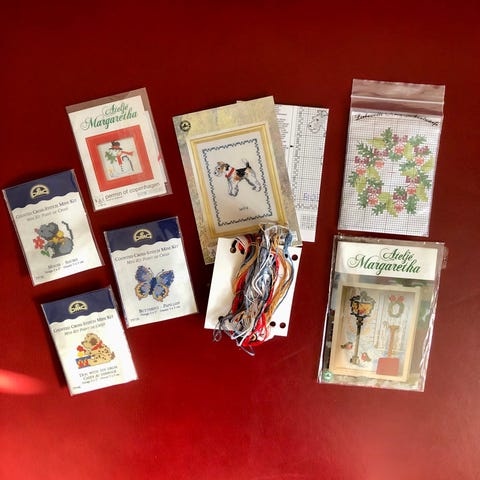 Indeholder stof/dug med hulbort og optegning af motiv samt brodergarn og brodernål.