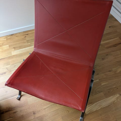Stol / loungestol fra designeren Poul Kjærholm “PK 22” sælges. lænestol med stel af stål, betrukket med sort skind. Produceret hos Fritz Hansen.