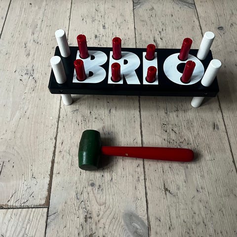 BRIO Børnelegetøj bestående af et gult slagbræt med blå pinde og en hammer med grøn hoved og rød håndtag. Legetøjet er designet til børn og fremstillet i træ og plastik.