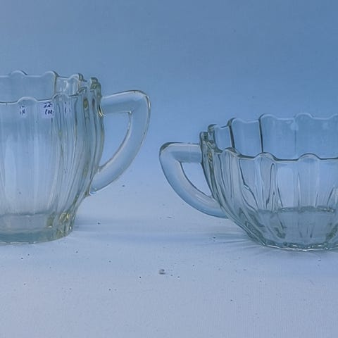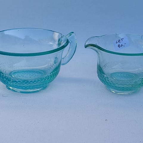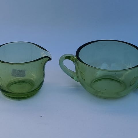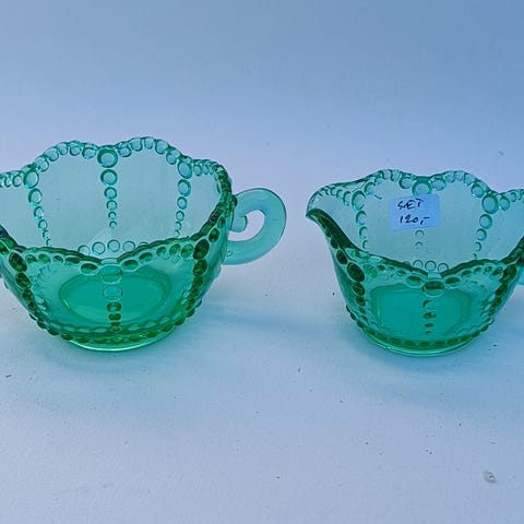 Sukkerskål og flødekande i yndigt presset glas.