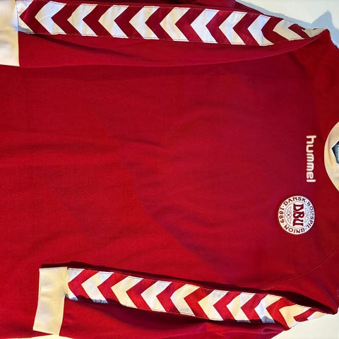 Hummel DBU Fodboldtrøje i størrelse M til mænd. Trøjen er rød med hvide detaljer og er designet til fodboldbrug.