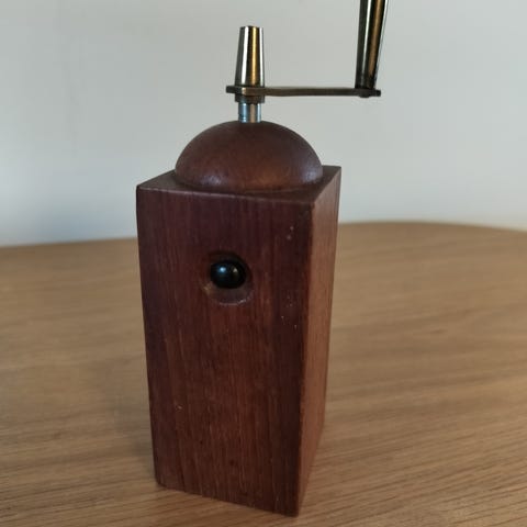 Et brag af en skulpturel pebermølle / peberkværn i teak med en flot, varm lød. Messingskrue i toppen. Fremstillet af Gunnar Flørnings firma Aniform A/S for Laurids Lønborg. H 23 cm. Flot stand. Sjældent udbudt.